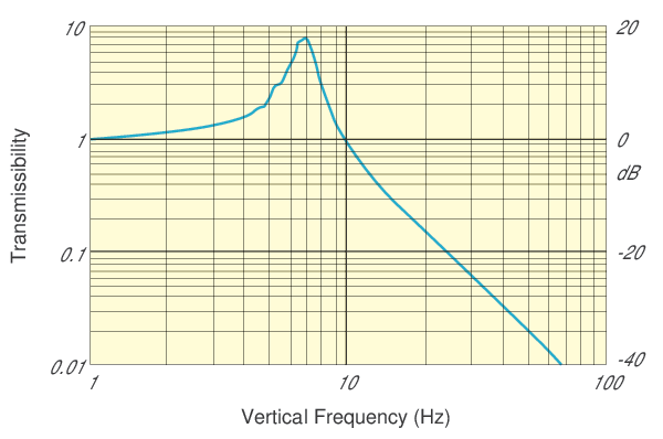 When a payload is placed on the isolation bearings, they will deflect. Vertical vibration isolation is achieved by effectively levitating the payload with a quasi-rigid body: Newport's proprietary non-linear spring mechanism with near-zero tangential stiffness for micro-vibrations. The natural frequency of the spring remains relatively low and constant across a large range of spring compression for which the compression force is matched by the restoring force. In this range, a low percentage of vibrations is transferred through the spring filter.