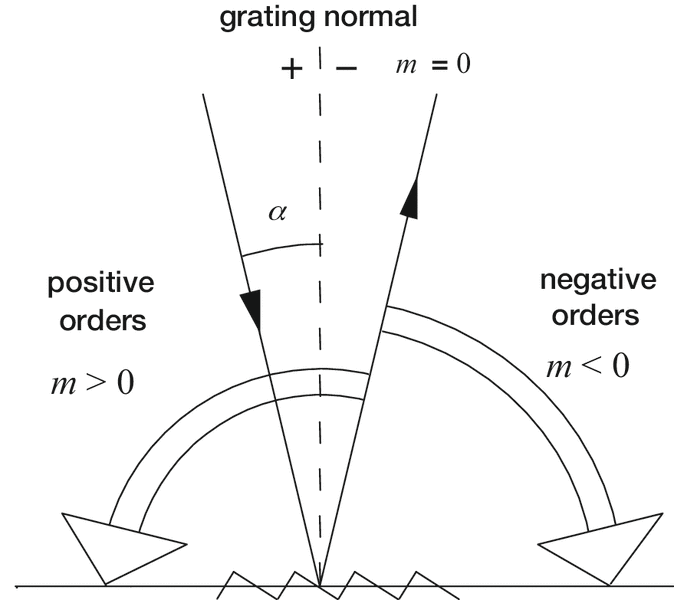 For λ/d << 1, a large number of diffracted orders will exist. As seen from the grating equation mλ= d (sinα + sinβ), the distinction between negative and positive spectral orders is that