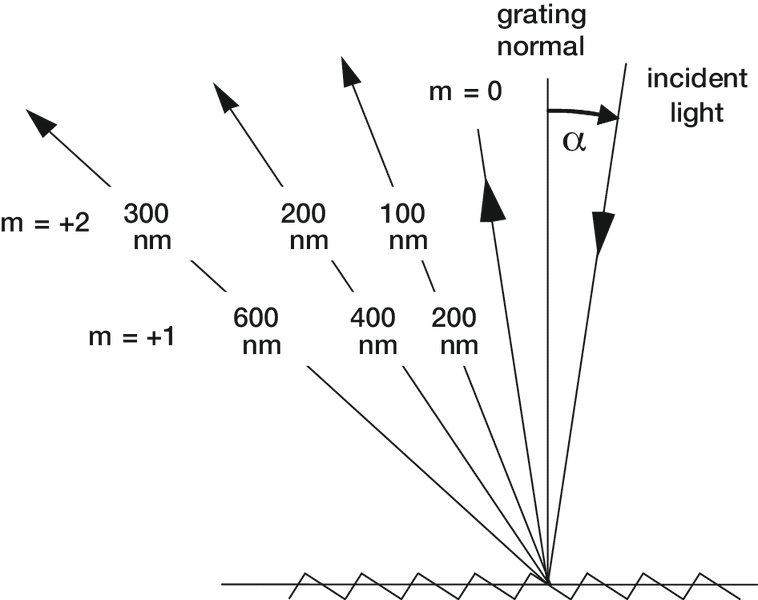 The most troublesome aspect of multiple order behavior is that suc-cessive spectra overlap, as shown in Figure 2-5. It is evident from the grating equation that light of wavelength λ diffracted by a grating along direction β will be accompanied by integral fractions λ/2, λ/3, etc.; that is, for any grating instrument configuration, the light of wavelength λ diffracted in the m = 1 order will coincide with the light of wavelength λ/2 diffracted in the m = 2 order, etc. In this example, the red light (600 nm) in the first spectral order will overlap the ultraviolet light (300 nm) in the second order. A detector sensitive at both wavelengths would see both simultaneously. This superposition of wavelengths, which would lead to ambiguous spectroscopic data, is inherent in the grating equation itself and must be prevented by suitable filtering (called order sorting), since the detector cannot generally distinguish between light of different wavelengths incident on it (within its range of sensitivity). [See also Section 2.7 below.]
