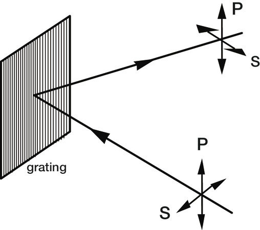 In many instances the diffracted power depends on the polarization of the incident light. P-plane or TE polarized light is polarized parallel to the grating grooves, while S-plane or TM polarized light is polarized perpendicular to the grating grooves (see Figure 9-2). For completely unpolarized incident light, the efficiency curve will be exactly halfway between the P and S efficiency curves.
