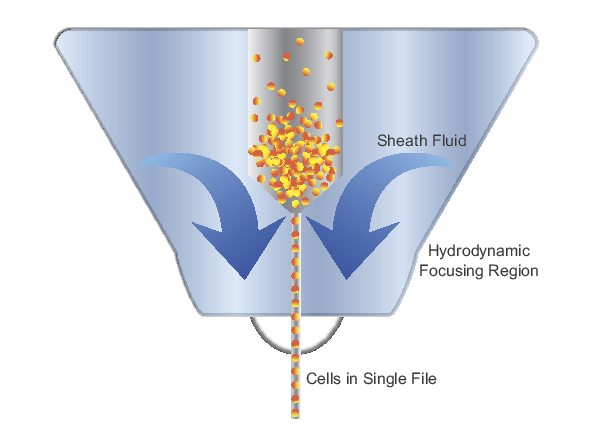 The fluidics system creates a stream of single particles that can be interrogated individually by the instrument's detection system. The sample is focused by the Bernoulli effect (Figure 2), creating a stream of particles in single file using a method called hydrodynamic focusing. Under optimal conditions (laminar flow), there is no mixing of the central fluid stream and the sheath fluid.