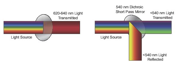 When placed at an angle to the oncoming light, a dichroic filter acts as a mirror, allowing it to perform two functions: transmitting specific wavelengths in the forward direction and reflecting the remaining light at a 90o angle. This allows the light path to be passed through a series of filters. The precise choice and order of the filters can be arranged so that multiple signals can be detected simultaneously (Figure 4).