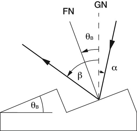 where θB (often called the blaze angle of the grating) is the angle between the face of the groove and the plane of the grating (see Figure 2-9). When the blaze condition is satisfied, the incident and diffracted rays follow the law of reflection when viewed from the facet; that is, we have