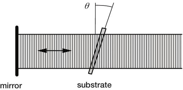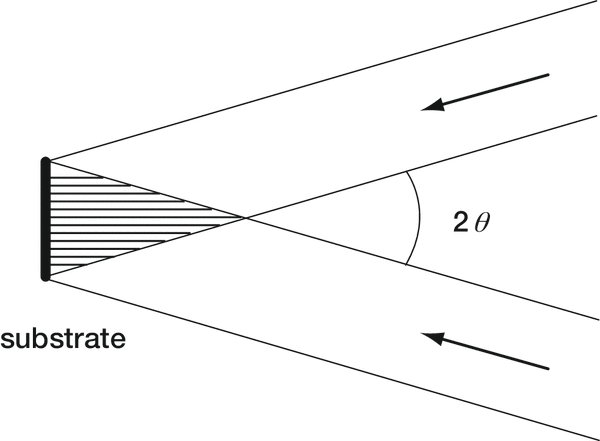 An interference pattern can be generated from a single collimated monochromatic coherent light beam if it is made to reflect back upon itself. A standing wave pattern will be formed, with intensity maxima forming planes parallel to the wavefronts. The intersection of this interference pattern with a photoresist-covered substrate will yield on its surface a pattern of grooves, whose spacing d depends on the angle θ between the substrate surface and the planes of maximum intensity (see Figure 4-2); the relation between d and θ is identical to Eq. (4-1), though it must be emphasized that the recording geometry behind the single-beam holographic grating (or Sheridon grating) is different from that of the double-beam geometry for which Eq. (4-1) was derived.
