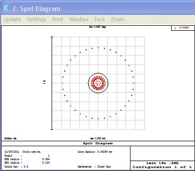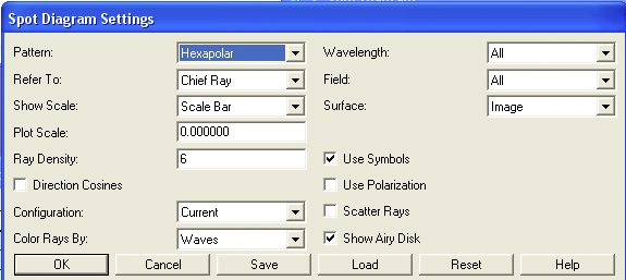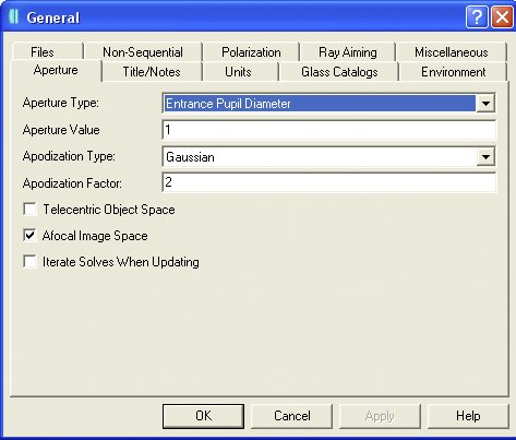 In the General settings window under the System menu, set the Aperture Type to Entrance Pupil Diameter The Aperture Value to 1 mm, the Apodization Type to Gaussian, the Apodization Factor to 2, and check the Afocal Image Space option. In the Spot Diagram Settings window set Pattern to Hexapolar. Choose to show the Airy disk.