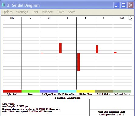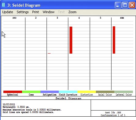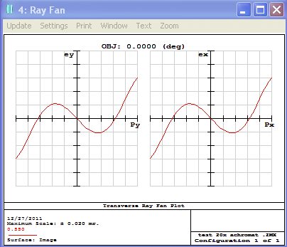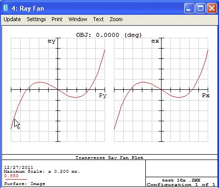 Again, the major contribution to the system aberrations is from the spherical term. The overall contribution from the Seidel diagram is approximately 0.0025 mm. The Ray Diagram shows the spherical aberrations to be well balanced.