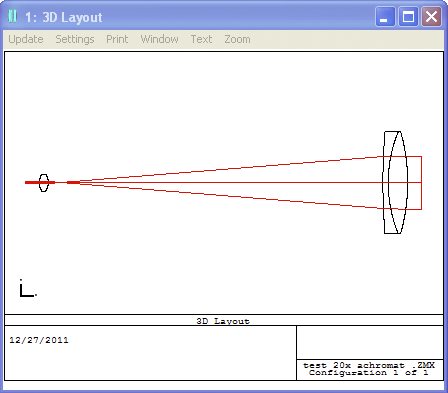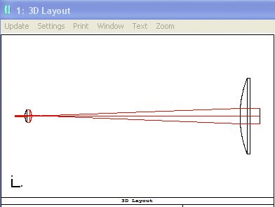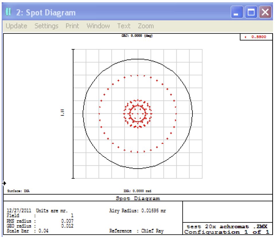 After updating, doing a short automatic optimization, and updating again, you should see the following results. Note that we have optimized this configuration for one wavelength only, 550nm. The distance between the lenses will change slightly depending on the wavelength used. This is due to the variation in focal lengths throughout the acceptable spectral range of the lens materials and coatings as you move away from the design wavelength(s). The Spot Diagram shows a near diffraction limited result.