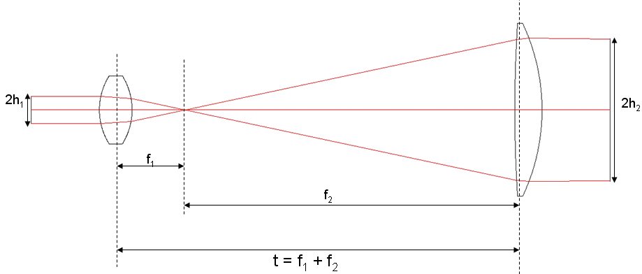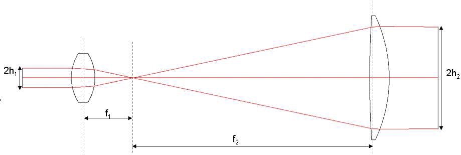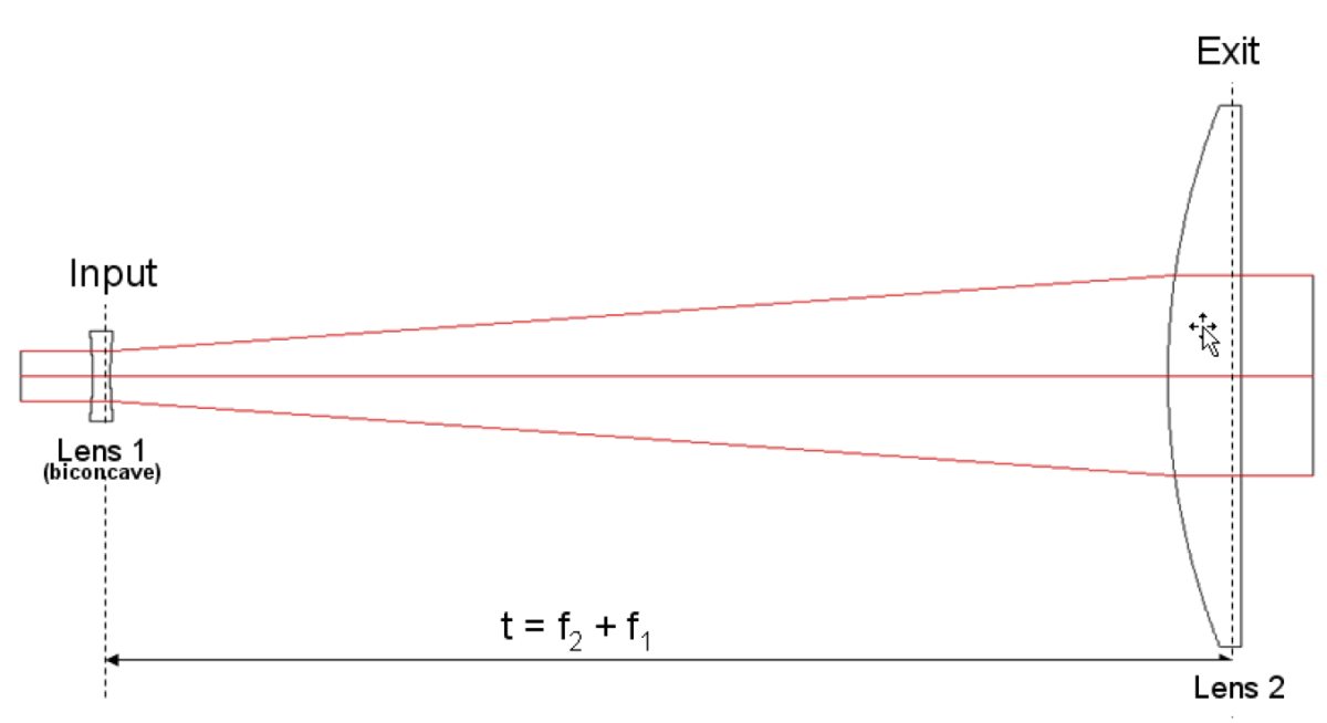 Simple beam expanders, sometimes referred to as telescopes, in their most basic forms generally consist of two lenses. The first lens should have a diameter larger than the maximum expected input diameter of the incoming light source. For example, if the diameter of the incoming beam is 10 mm, a 12 mm diameter lens will do a nice job with a little room to spare. The input beam is assumed to be collimated.