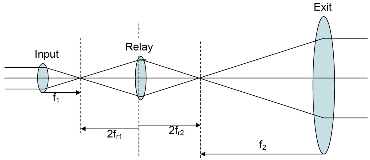 In this example, the simplest version of a relay lens would be a biconvex lens inserted between the input and output lenses of the beam expander, such that distance between the input lens and the relay lens is:
