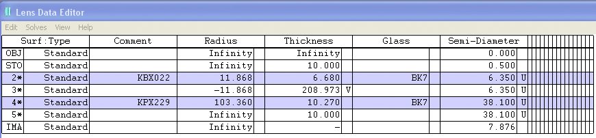 Begin with a blank Lens Data Editor with the Stop set to surface 1. Enter the KBX022 biconvex, 12.7 mm diameter, 12.7 mm focal length lens onto surface 2 using the Lens Catalog. This is the entry lens for the beam expander.
