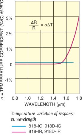 If a detector without a temperature sensor is used with lasers operating at wavelengths beyond the wavelength maximum, they MUST be used only under constant temperature conditions. Any comparisons of data from different photodiode sensors used for measurements of similar lasers operating beyond the wavelength maximum are only valid if the data is collected at exactly equal temperatures. Otherwise, photodiode sensors should not be employed with lasers operating at wavelengths near or beyond the semiconductor material maximum.