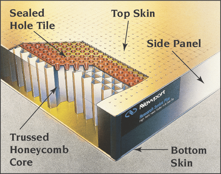 Trussed Core Design - Newport innovated the trussed core design to maximize the table's rigidity-to-weight ratio. The trussed core design uses an additional steel member to bridge across the center of the honeycomb cell. This extra mechanical component significantly stiffens the cell, with very little increase in weight. The truss improves both the static and dynamic rigidity and increases the structure's point load carrying ability. Many manufacturers use a traditional open cell construction, which is not as statically rigid, when compared to a Newport table.