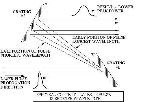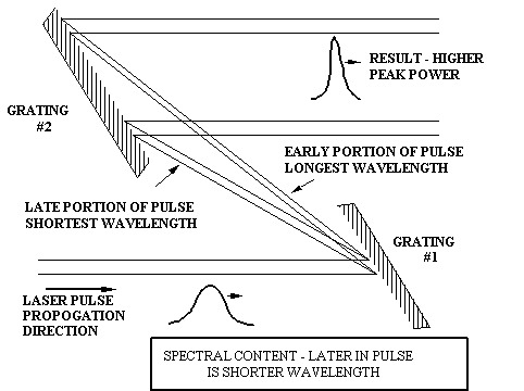 When a spectrally broad laser pulse is incident on a diffraction grating, the various wavelengths that make up the pulse will diffract from the grating at angles that depend on wavelength. If this pulse has its wavelength "chirped" so that the frequency increases during the length of the pulse, then diffraction will spread out the light in proportion, with the first part of the pulse (longer wavelengths) diffracting at a larger angle. The trailing portion of the pulse (shorter wavelengths) will diffract at a smaller angle and is directed to the leading edge of the second grating (see Figure 1). When the light diffracts from the second grating, which is oriented parallel to the first grating, the different parts of the pulse (with their correspondingly different wavelengths) will diffract at angles which yield a pulse whose parts are nearly in time synchronism. Peak power greatly increases, while total energy remains nearly the same.