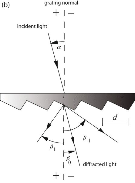Diffraction by a grating can be visualized from the geometry in Figure 2-1, which shows a light ray of wavelength λ incident at an angle α and diffracted by a grating (of groove spacing d, also called the pitch) along at set of angles {βm}. These angles are measured from the grating normal, which is shown as the dashed line perpendicular to the grating surface at its center. The sign convention for these angles depends on whether the light is diffracted on the same side or the opposite side of the grating as the incident light. In diagram (a), which shows a reflection grating, the angles α > 0 and β1 > 0 (since they are measured counter-clockwise from the grating normal) while the angles β0 < 0 and β–1 < 0 (since they are measured clockwise from the grating normal). Diagram (b) shows the case for a transmission grating. In both cases, the sign conventions are such that, for the m = 0 order, β0 = –α.