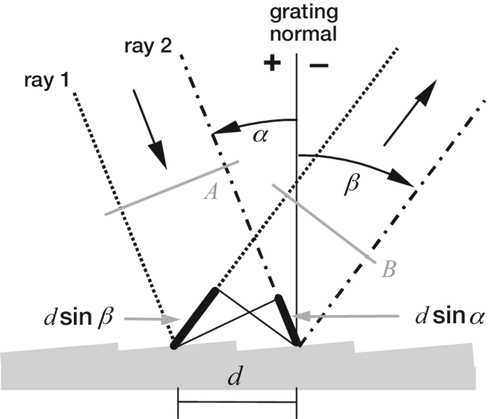 Another illustration of grating diffraction, using wavefronts (surfaces of constant phase), is shown in Figure 2-2. The geometrical path dif-ference between light from adjacent grooves is seen to be d sinα + d sinβ. [Since β < 0, the term d sinβ is negative.] The principle of constructive interference dictates that only when this difference equals the wavelength λ of the light, or some integral multiple thereof, will the light from adjacent grooves be in phase (leading to constructive interference). At all other angles, the Huygens wavelets originating from the groove facets will interfere destructively.