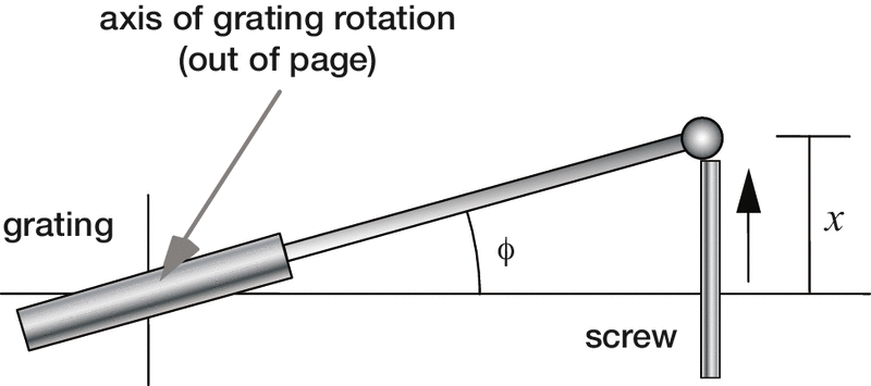 Here K is called the half deviation angle because the angle between the incident and diffracted beams is 2K. This version of the grating equation is useful for monochromator mounts (see Chapter 7). Eq. (2-8) shows that the wavelength diffracted by a grating in a monochromator mount is directly proportional to the sine of the scan angle Φ through which the grating rotates, which is the basis for monochromator drives in which a sine bar rotates the grating to scan wavelengths (see Figure 2-3).