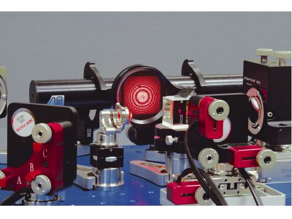 As shown on Triple-Divide™ Translation Stages, light from a HeNe laser is turned by a Model 8817-8-V motorized Stability™ center mount and Model 8809 motorized corner mount, expanded by a Model 5725-H aspheric lens and is split by a 50/50 beamsplitter cube so that the two beams travel different paths. The first travels to the fixed mirror held in the Model 8807 motorized center mount. The second travels to a movable mirror held in a Model 9814-8 top mount on a Model 9067-COM-E 1 in. travel encoded stage. The two beams recombine back in the beamsplitter and the interference pattern is displayed on the screen held in the Model 9852 Opti-Claw™ mount.