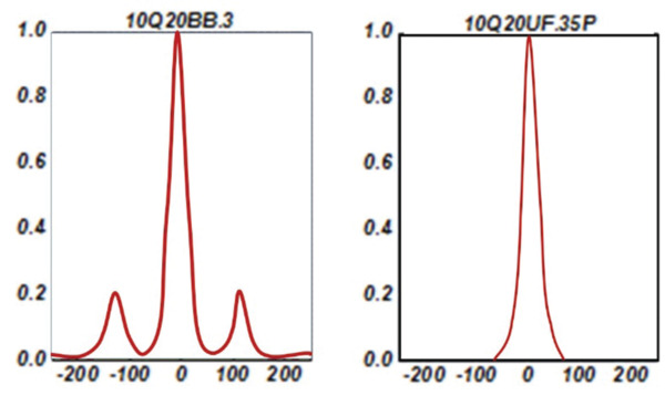 The two graphs in Figure 2 clearly demonstrate the distortion that occurs when an ultrashort pulse is reflected by a standard dielectric mirror (left) as compared to the same pulse reflected by a mirror optimized for use with an ultrafast laser (right).