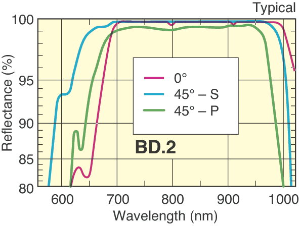 Our BD.2 coating offers high reflectance for near infrared diode laser applications. Reflectivity is greater than 99% for s-polarization and 97% for p-polarization from 700 – 950 nm at 0 – 45° angle of incidence. Greater than 80% average reflectivity at 632.8 nm is also provided to permit easy alignment using a HeNe laser.