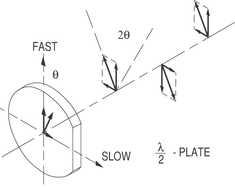 A half-wave plate can rotate the plane of polarization from a polarized laser to any other desired plane. Suppose a plane-polarized wave is normally incident on a wave plate, and the plane of polarization is at an angle θ with respect to the fast axis. To see what happens, resolve the incident field into components polarized along the fast and slow axes, as shown. After passing through the plate, pick a point in the wave where the fast component passes through a maximum. Since the slow component is retarded by one half-wave, it will also be a maximum, but 180° out of phase, or pointing along the negative slow axis. If we follow the wave further, we see that the slow component remains exactly 180° out of phase with the original slow component, relative to the fast component. This describes a plane-polarized wave, but making an angle θ on the opposite side of the fast axis. Our original plane wave has been rotated through an angle 2θ.