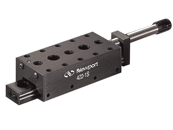 The 422-1S Miniature Ball Bearing Linear Stages with 1 inch (25.4 mm) travel is ideal for positioning applications in opto-mechanical instrumentation and laboratory experiments requiring linear motion within a small space. The translating platform rides on a precision ground rail using ball bearings rolling between opposing pairs of hardened and ground steel rods. The stages are preloaded to provide smooth, accurate motion. Ball-tipped 80-pitch screws are spring loaded against the platform to provide high resolution, low backlash performance. The spring and drive are removable for applications requiring an externally driven linear slide. An array of mounting holes on both the platform and the rail provide a variety of convenient mounting options, including post-mounting on SP Series Posts. The stages are designed to stack for X-Y motion. Vertical motion may also be added using the Model 411B Bracket, which is reversible so a vertical stage can be mounted either for a low profile or to center a heavier load.