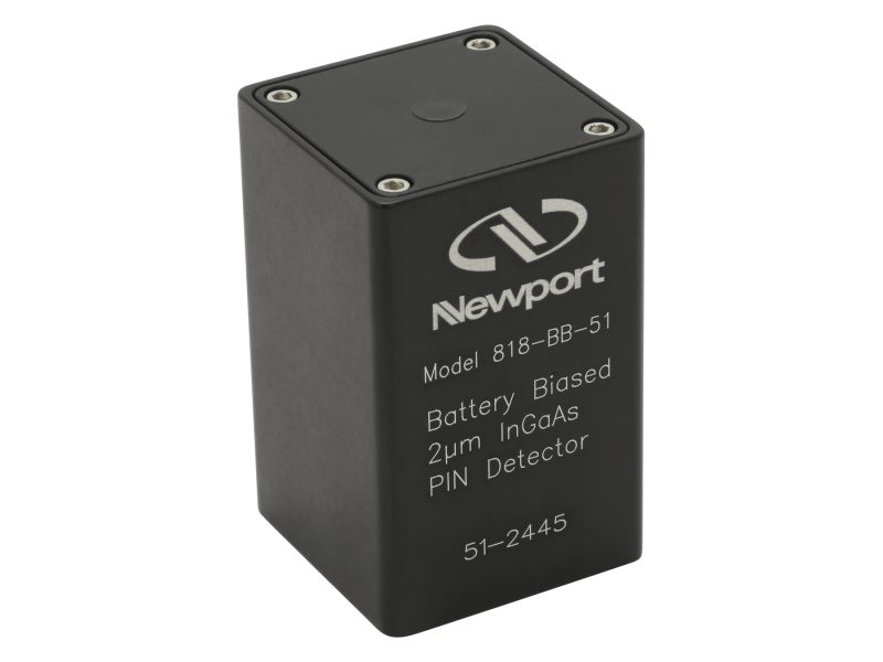 The 818-BB-30, -31, and -35 consist of free-space, small and large area InGaAs detectors, with rise times ranging from 300 ps to 1.5 ns for covering the 1000-1600 nm wavelength range. Each unit includes a built-in bias supply consisting of standard 3 V lithium cells and a 50 ohm BNC connector output. The 818-BB-51 features an extended InGaAs photodetector with a wavelength range of 1475–2100 nm.