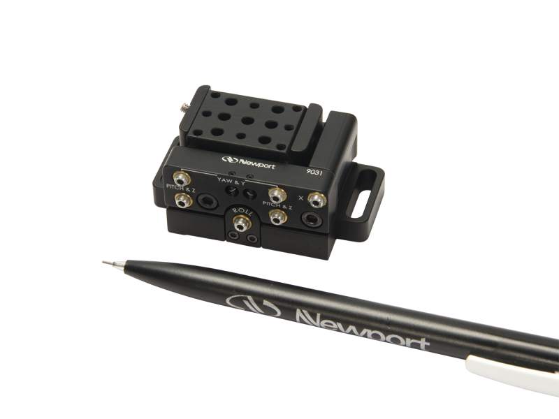 The 9031-M is a six-axis aligner that allows intuitive adjustment of optical axes that comprise an input and an output (e. g., electro-optic or acousto-optic modulators or lenses). The 9031-M is exceptionally compact, having a 36 x 61 x 25 mm envelope yet still provides all six degrees of motion in a single device. The 9031-M features a removable, M3 threaded top plate along with keying pin holes in the base for industrial applications. (US Patent Number 5,303,035)