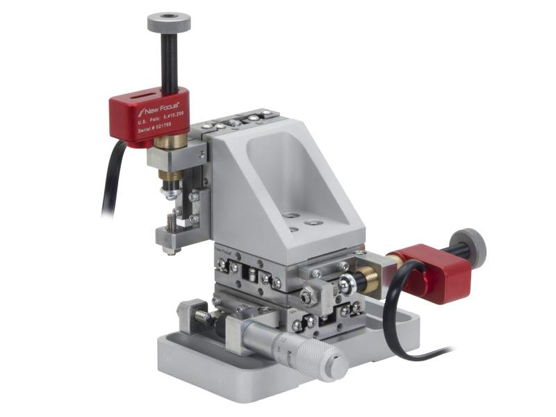 The 9062-XYZ-NPP Motorized Gothic-Arch Bearing Stage incorporates our Picomotor™ actuators with our 40 x 40 mm platform gothic-arch-bearing translation stages to achieve the ultimate in stability and rigidity along with remote-control operation. A Picomotor actuator controls the Y and Z axes, while the X axis is micrometer controlled. All necessary clamps, brackets, and base plates are included so that the stage can be used right out of the box. These stages offer stainless-steel construction, thumbscrew locks, and 0.5 inch (12.7 mm) travel range. Gothic-arch bearings offer the smooth motion of ball bearings but high stiffness and repeatability. The unique gothic profile provides four points of contact (rather than two) so that the load and momentum are more evenly distributed. Side-mounted micrometer clamps minimize the overall footprint. 8-32 and 1/4-20 threads