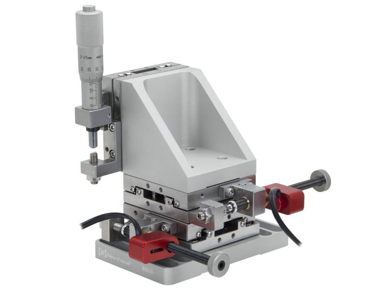 The 9063-XYZ-PNN Motorized Gothic-Arch Bearing Stage incorporates our Picomotor™ actuators with our 65 x 65 mm platform gothic-arch-bearing translation stages to achieve the ultimate in stability and rigidity along with remote-control operation. A Picomotor actuator controls the X axis, while the Y and Z axes are micrometer controlled. All necessary clamps, brackets, and base plates are included so that the stage can be used right out of the box. These stages offer stainless-steel construction, thumbscrew locks, and 1 inch (25.4 mm) travel range. Gothic-arch bearings offer the smooth motion of ball bearings but high stiffness and repeatability. The unique gothic profile provides four points of contact (rather than two) so that the load and momentum are more evenly distributed. Side-mounted micrometer clamps minimize the overall footprint. 8-32 and 1/4-20 threads