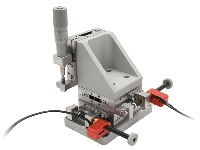The 9063-XYZ-PPN Motorized Gothic-Arch Bearing Stage incorporates our Picomotor™ actuators with our 65 x 65 mm platform gothic-arch-bearing translation stages to achieve the ultimate in stability and rigidity along with remote-control operation. A Picomotor actuator controls the X and Y axes, while the Z axis is micrometer controlled. All necessary clamps, brackets, and base plates are included so that the stage can be used right out of the box. These stages offer stainless-steel construction, thumbscrew locks, and 1 inch (25.4 mm) travel range. Gothic-arch bearings offer the smooth motion of ball bearings but high stiffness and repeatability. The unique gothic profile provides four points of contact (rather than two) so that the load and momentum are more evenly distributed. Side-mounted micrometer clamps minimize the overall footprint. 8-32 and 1/4-20 threads