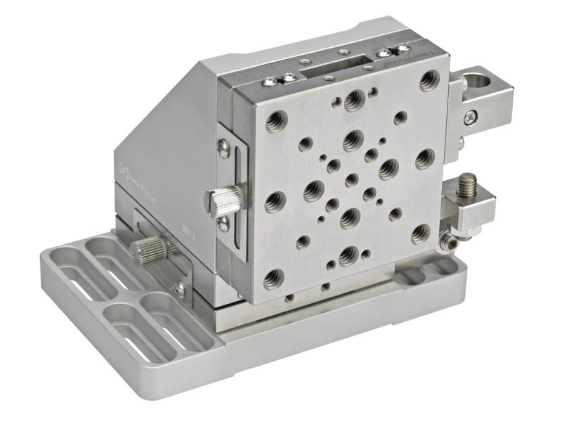 The 9063-XZ-M Gothic-Arch XZ Translation Stage uses stainless-steel construction and thumbscrew locks to offer the ultimate in stability and rigidity. Gothic-arch bearings offer the smooth motion of ball bearings but high stiffness and repeatability over the 25.4 mm travel range. The 65 x 65 mm platform features M2, M4 and M6 mounting holes. The unique gothic profile provides four points of contact (rather than two) so that the load and momentum are more evenly distributed. Side-mounted micrometer clamps minimize the overall footprint. These stages are compatible with our goniometers and rotation stages.