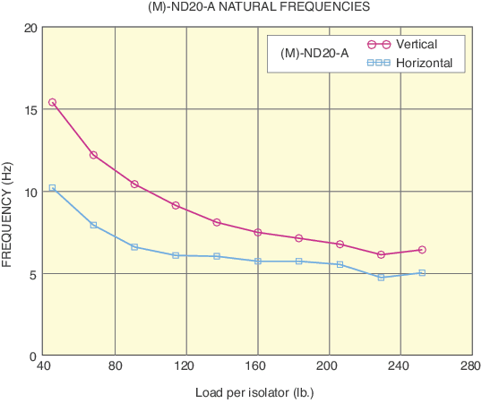 Constant Natural Frequency (CNF) is a complex property that reduces sensitivity to load deviations and offers a high degree of modal decoupling. The natural frequency of most elastomeric mounts lowers with increasing mass or increases with decreasing mass. This means that the vibration isolation characteristics will vary with load. NewDamp elastomeric isolators use special geometry profiled elastomers and mounting fixtures. These isolators accommodate changes in load with changes in stiffness which holds the stiffness to mass ratio constant. As a result, the CNF isolators deliver much better isolation than even softer conventional isolators do.