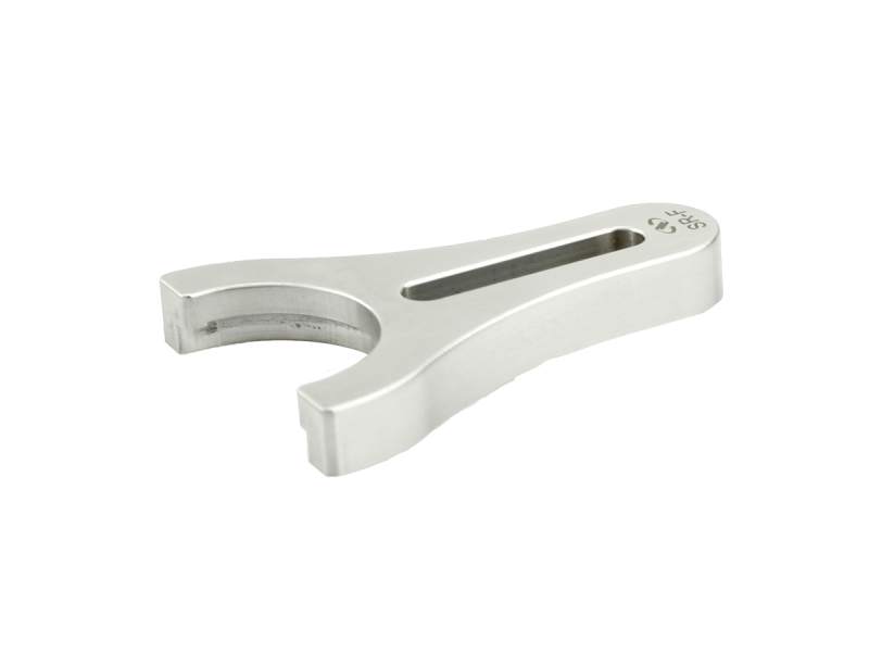 The SR-F Pedestal Pillar Clamping Fork is made with stainless steel and used to provide fixed mounting of any of the SR Series 1.5 in. (38.1 mm) diameter pedestal pillars. A 1/4-20 (M6) slot provides a full 1.0 in. (25.4 mm) of adjustment and is compatible with either 1/4-20 or M6 socket-head cap screws.