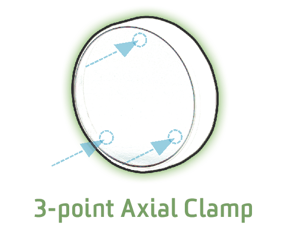 Interferometric testing results show the flatness of the mirrors held in these mounts, measure at 0.100 wave PV (peak to valley). Compare this to mirrors held in a mount with a nylon-tipped set screw where the flatness degrades to 0.600 to 0.800 wave PV. An unconstrained 1/10th wave mirror will typically measure 0.090 wave PV.