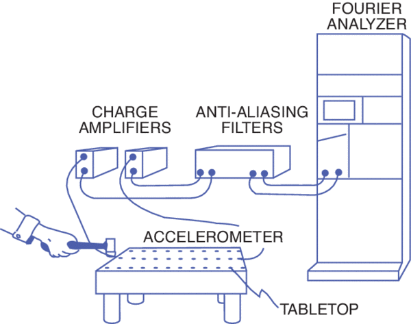 Modal properties are determined by exciting the structure with random vibration and measuring the response at an array of test points with a Fast Fourier Transform analyzer.