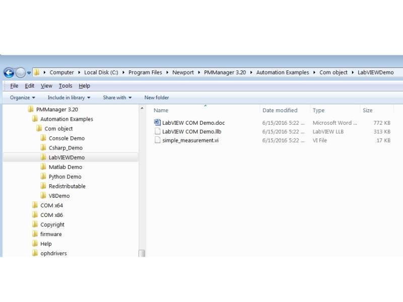 Demo client applications in VB.NET 2010, VC#.NET 2010, MatLab, and LabVIEW 2013 are provided with the PMManager installation and can be found in C:\Program Files\Newport\PMManager 3.xx\Automation Examples\Com object. A console application is provided as well.